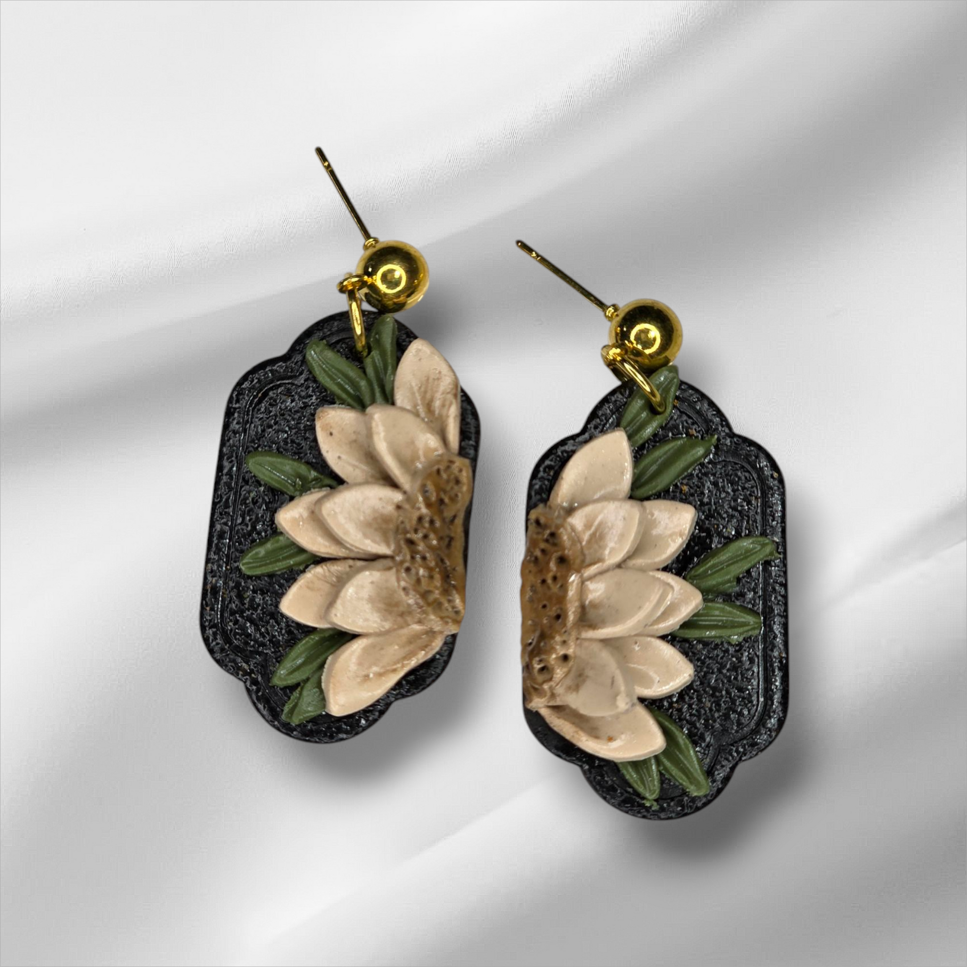 These elegant Framed Black With Tan Flower Earrings add a touch of sophistication to any outfit. The intricate flower design is framed with a sleek black backdrop, adding a subtle pop of color. Crafted with high-quality materials, these earrings will make a lasting impression and elevate your style. All hardware is hypoallergenic for your safety.