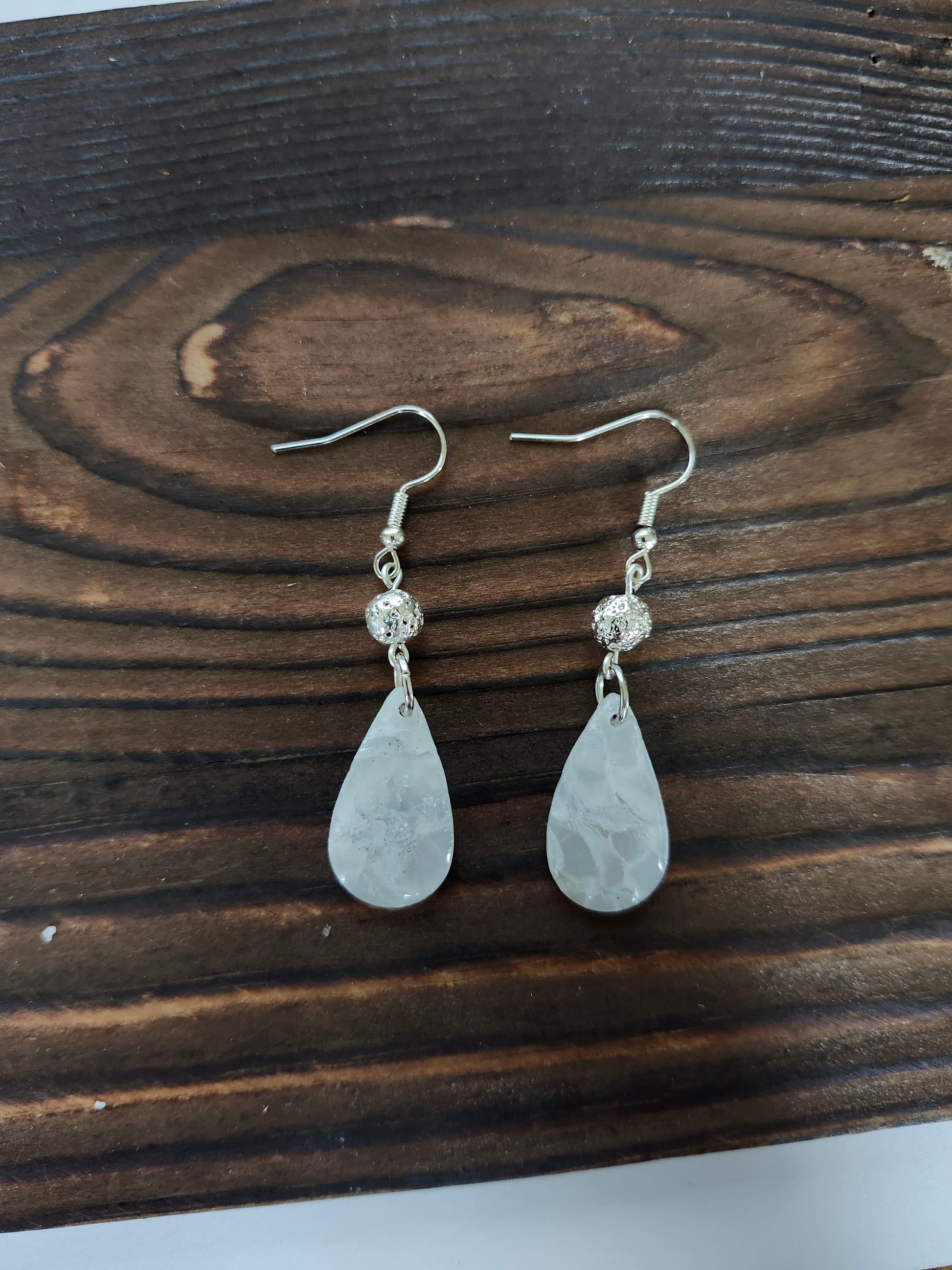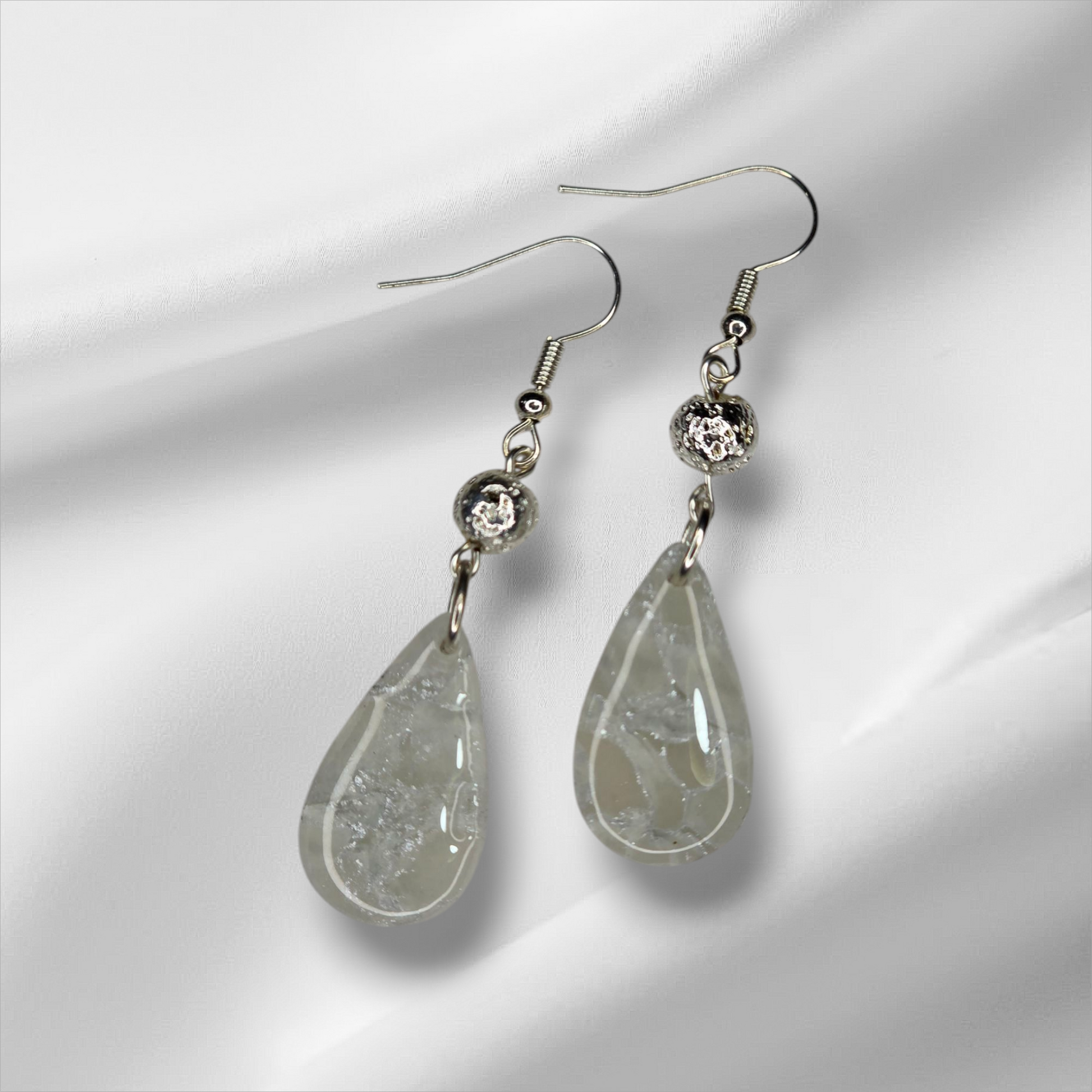 Silver Coated Lave Bead, White with silver Leaf Earrings