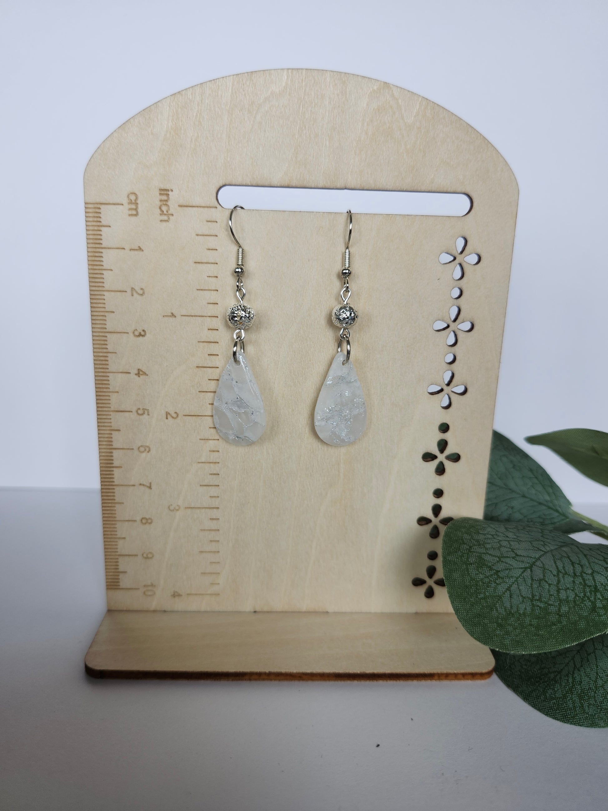 These earrings will elevate your style with their small white translucent marble teardrop design. The lightweight and versatile earrings are perfect for everyday wear, adding a touch of elegance to any outfit. Feel confident and chic with these unique and beautiful earrings!