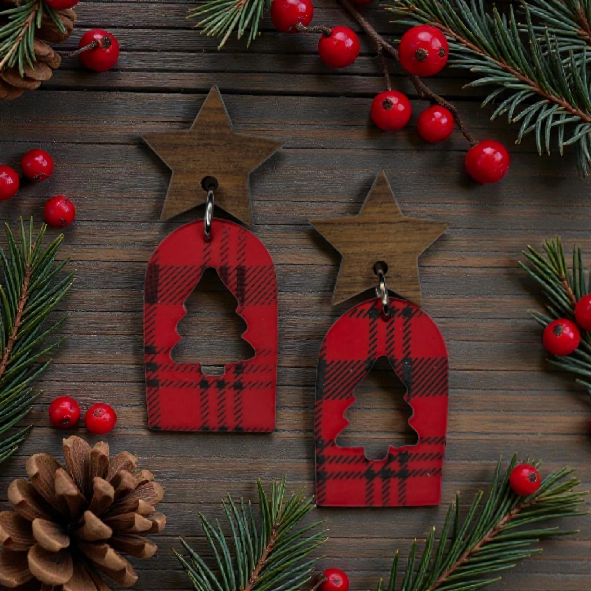 Introducing the festive Wood Star Stud earrings with a classic Black and Red Buffalo Plaid design. Made of high-quality wood, these earrings add a touch of holiday charm to any outfit. Lightweight and comfortable, they are the perfect accessory for your Christmas celebrations.